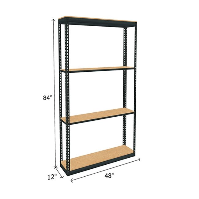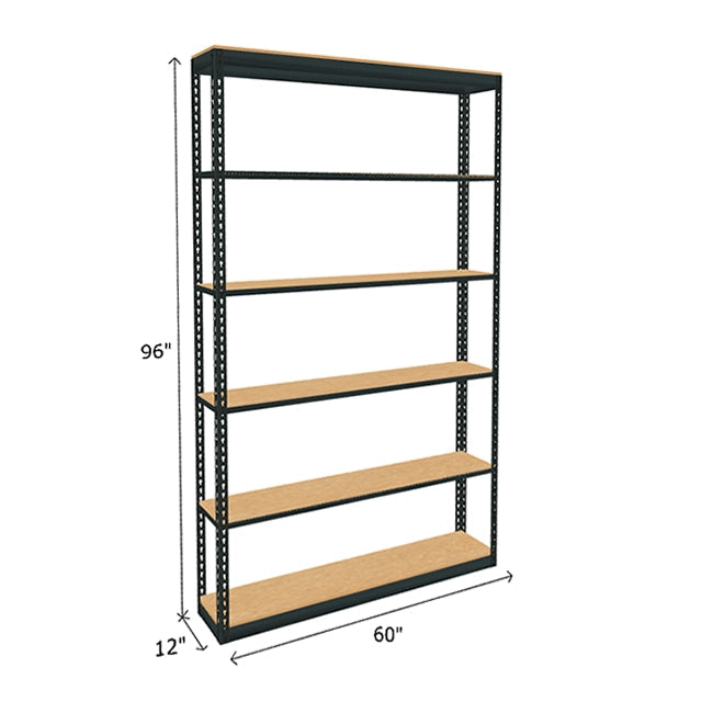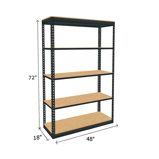 When it comes to boltless shelving, don't settle for anything except the highest quality. Heavy duty industrial grade boltless shelving from BuyRack utilizes low profile beams to provide more storage space between shelves as well as an easier access. Double Rivet Beams at top and bottom of unit form a rigid structure, offering more support. 450 lb. per shelf capacity. Ideal for light to medium duty applications in a commercial or industrial setting. This boltless shelving features 1/2" thick particle board decking. Steel frame color: dark gray. Particle board color: tan.