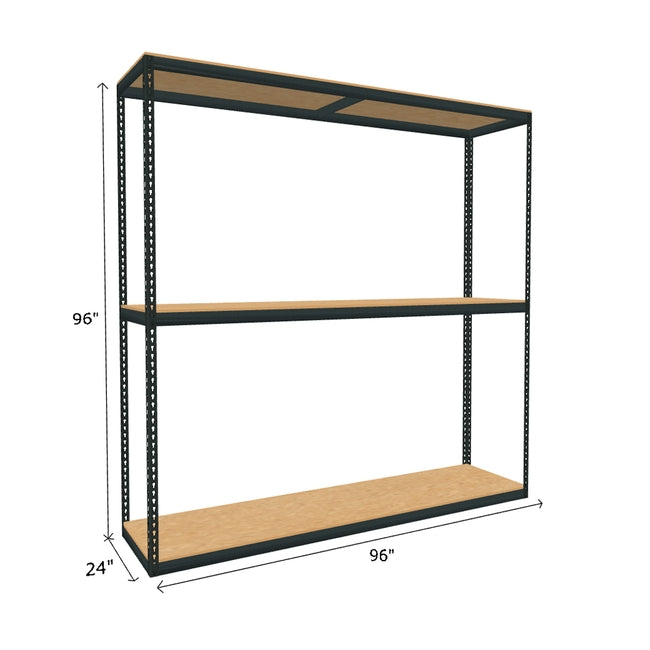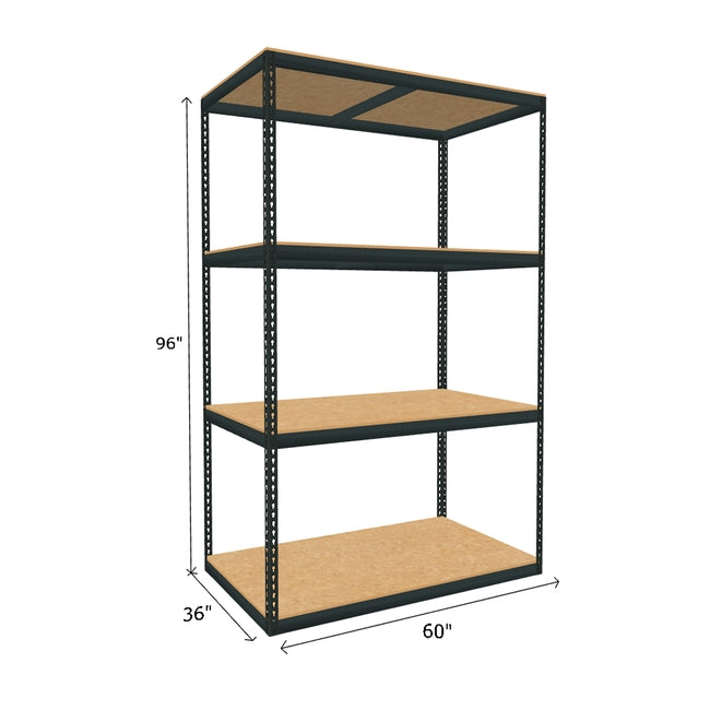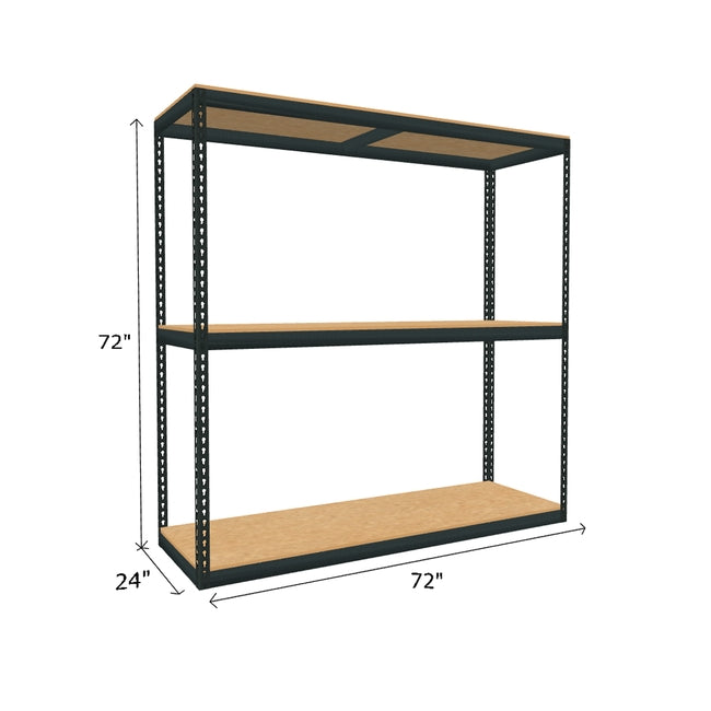 Heavy duty boltless shelving design provides for easy assembly without nuts, bolts or shelf clips. No cross braces are necessary, which makes these boltless shelving units accessible from all four sides. Available in a variety of sizes and capacities to meet your specific shelving requirements. Includes 1/2" particle board decking. Find the boltless shelving to meet your needs. Steel frame color: dark gray. Particle board color: tan.