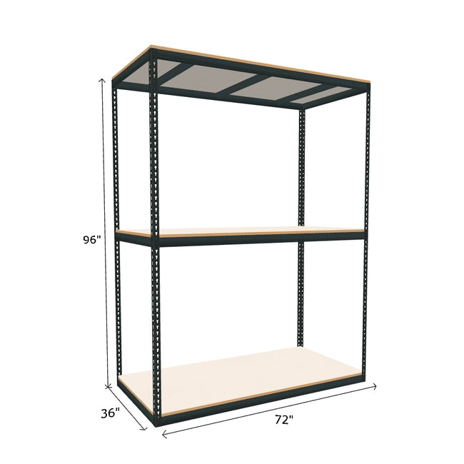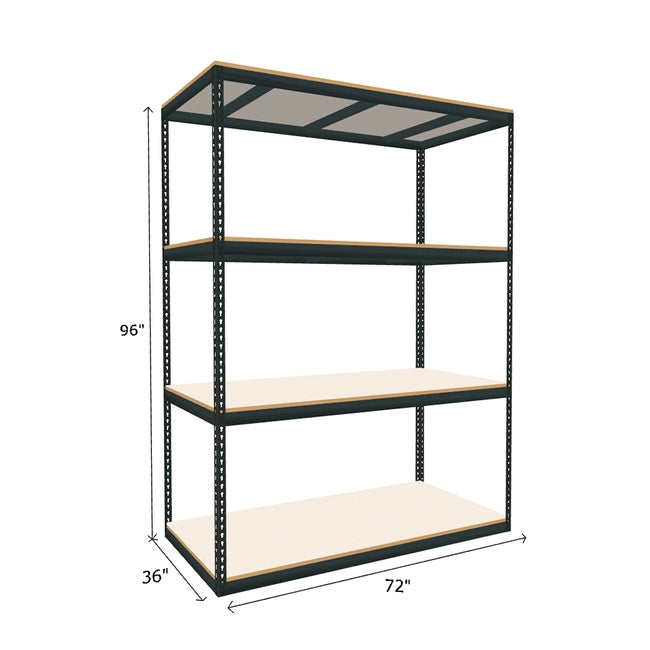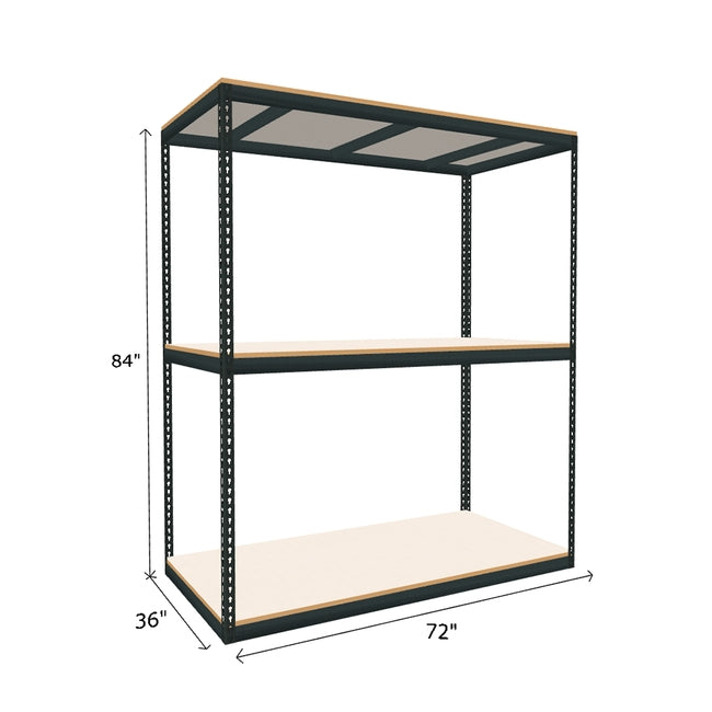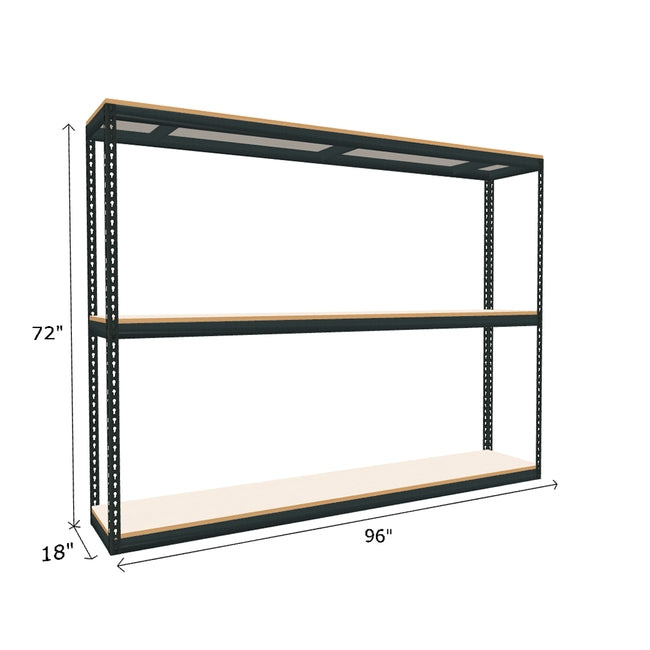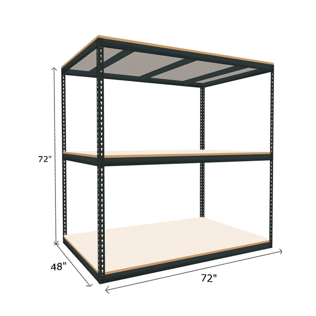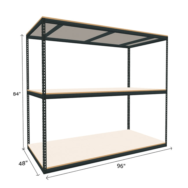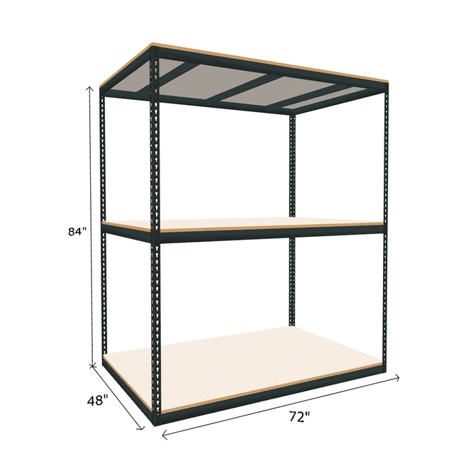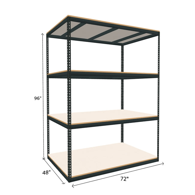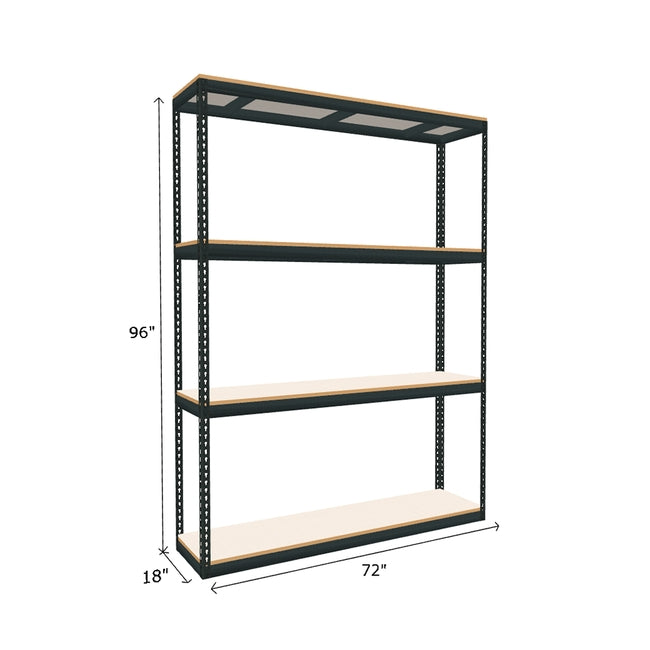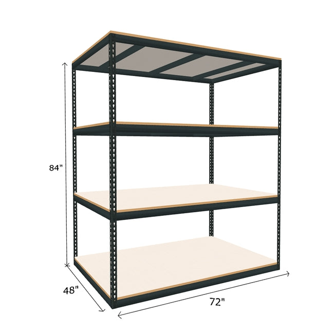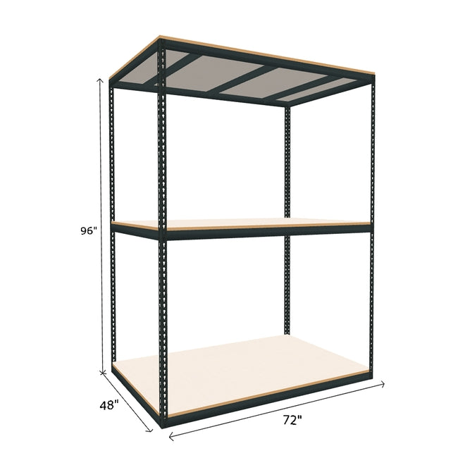 More storage space is achieved on this Super Duty industrial grade boltless shelving thanks to low profile beams. Features Double Rivet Beams at top and bottom of unit forming a rigid structure without the need for troublesome crossbars. White melamine shelves offer easy cleaning and provide 1500 lb. capacity per shelf on this bulk boltless shelving. Expertly constructed from the highest grade materials, our boltless shelving is meant to withstand the wear and tear of warehouses and other industrial applications. Steel frame color: dark gray. Melamine particle board color: white.