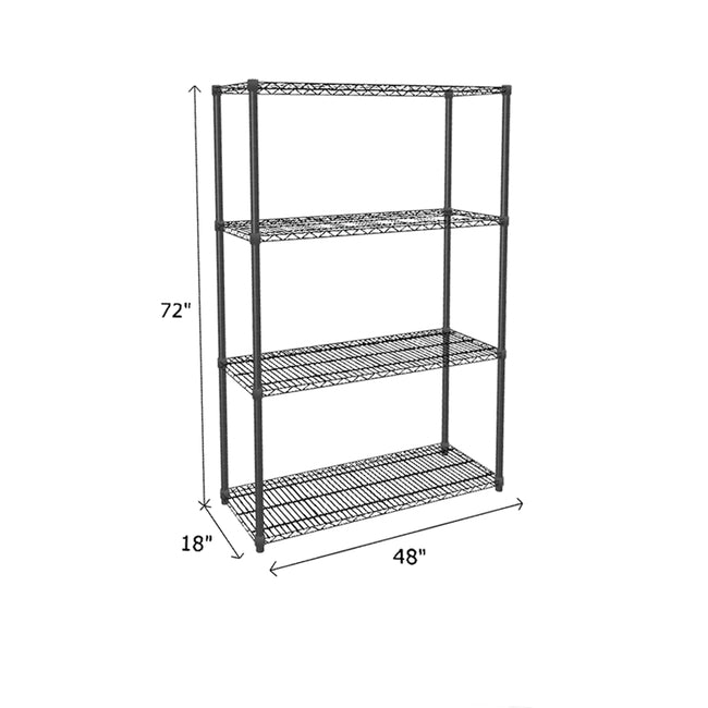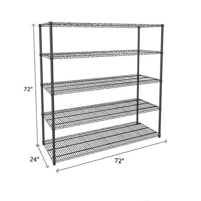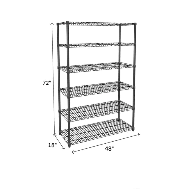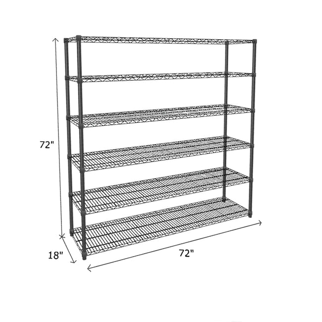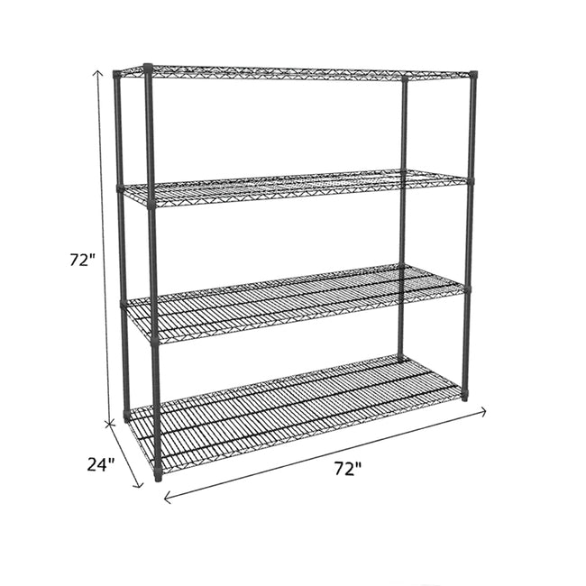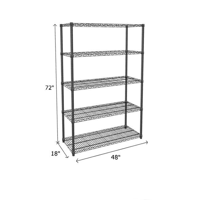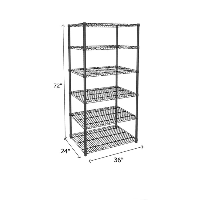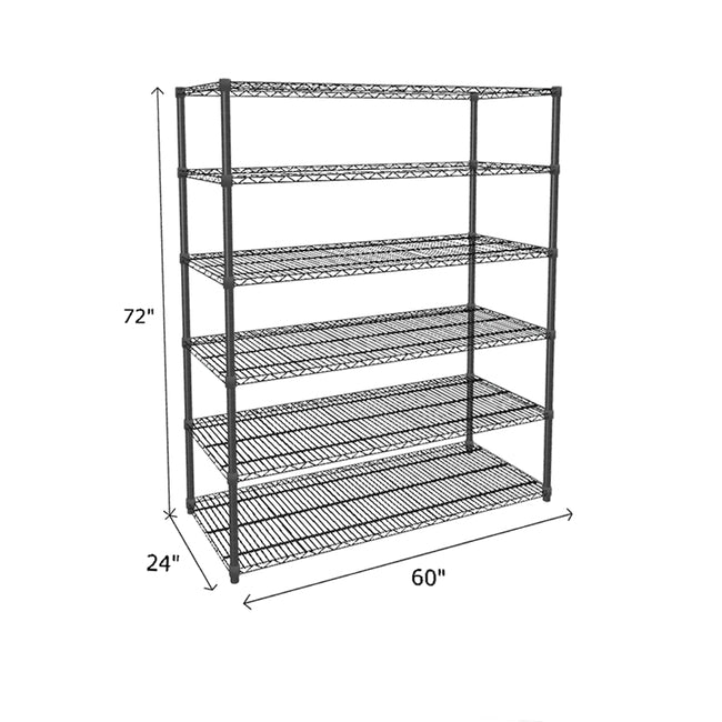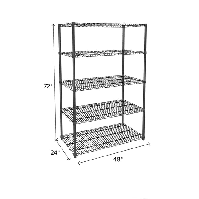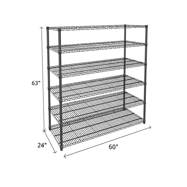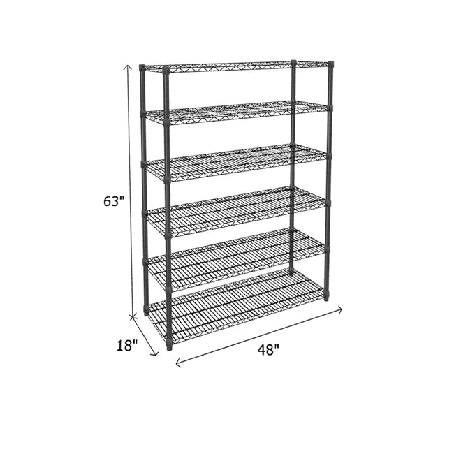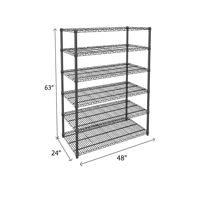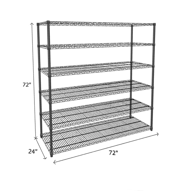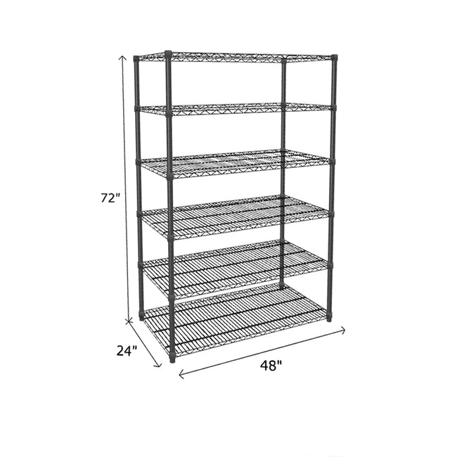 Black wire shelving is powder coated wire shelving made to the same high-quality standards as our chrome wire shelving but is substantially less expensive. Durable powder coated finish is rust and chip resistant. An open design allows more air and light to pass through for added visibility and helps reduce a build-up of dirt and dust. Black wire shelving units are NSF Certified for dry storage making them an excellent choice for many different commercial and industrial applications. Easy to assemble without any special tools, these black wire shelving units are also easy to clean with warm water and dish soap. Be sure to dry thoroughly before adding product. Browse our large selection of sizes to find the ideal height and capacity to fit your needs. Overall unit capacity is 2,000 lbs.